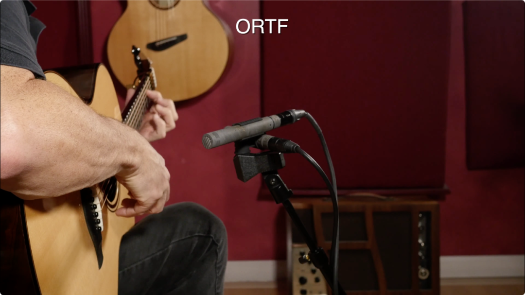 视频中所采用的,是在木吉他立体声录音中很常见的XY式话筒摆位!